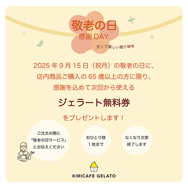 「kiricafe」にて好評のジェラートに季節のフレーバーが仲間入りしました。期間限定の味なのでぜひお試しください。